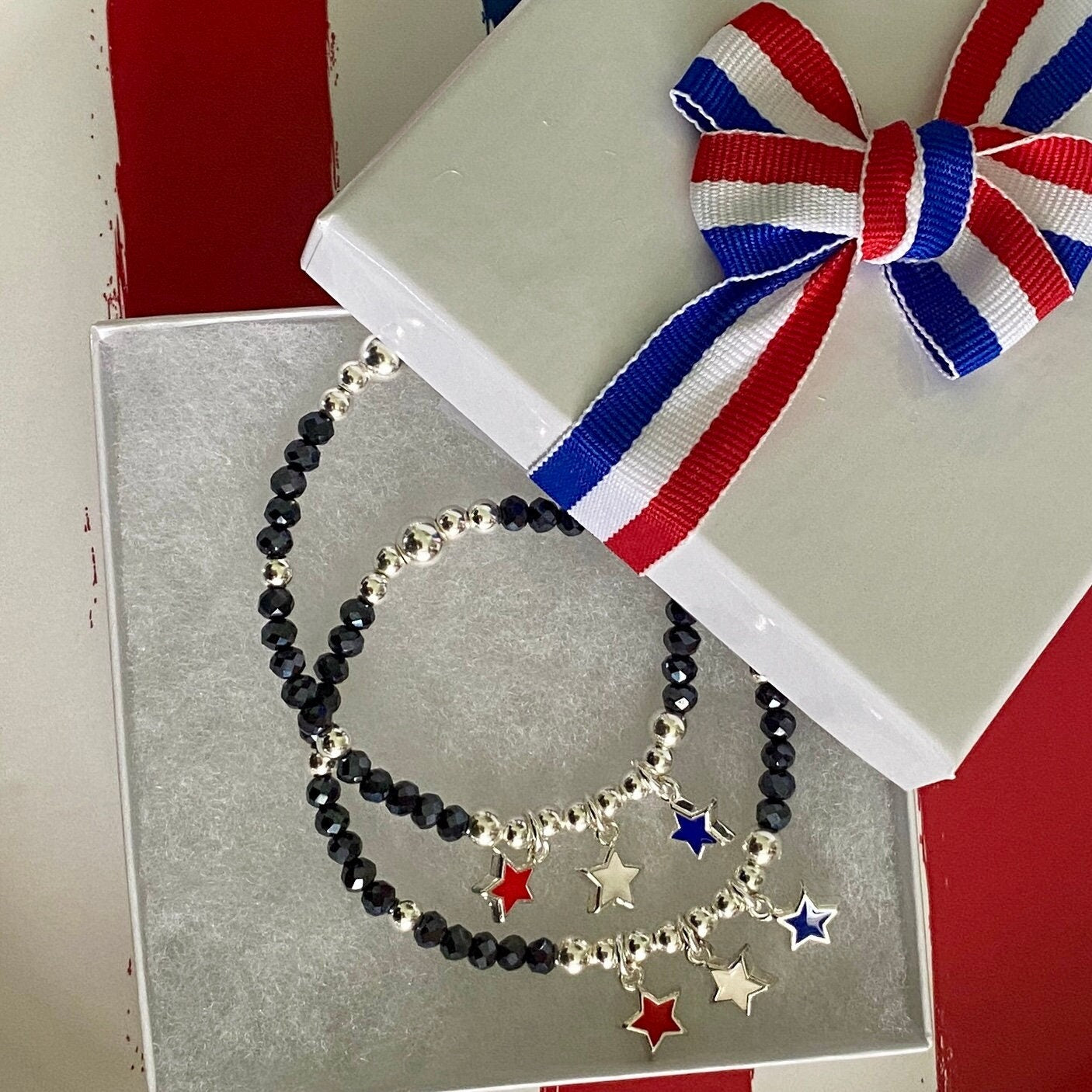 Show off your patriotic side with our 4th of July navy blue bracelet,with USA's red, white, and blue stars. This silver charm bracelet is the perfect way to celebrate Independence Day in style.
