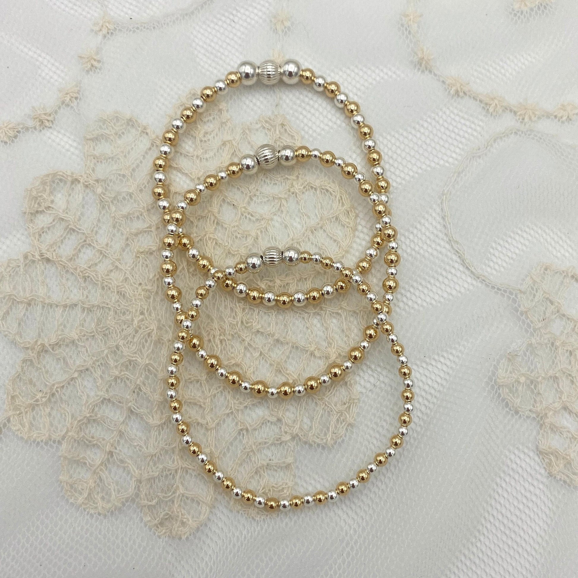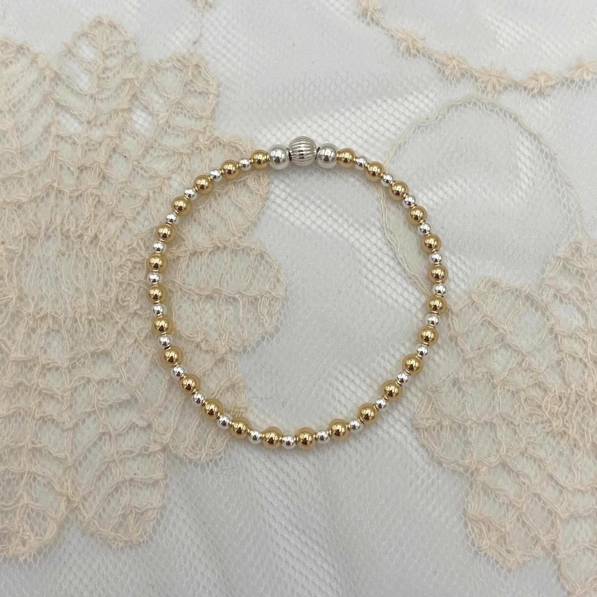 Elevate your everyday style with this stunning stretch bead bracelet, featuring a mix of sterling silver silver and gold filled that makes it perfect for office attire or as an everyday accessory. This versatile stacking bracelet comes as a thoughtful gift set, making it an ideal anniversary gift or boho jewelry addition to any collection.