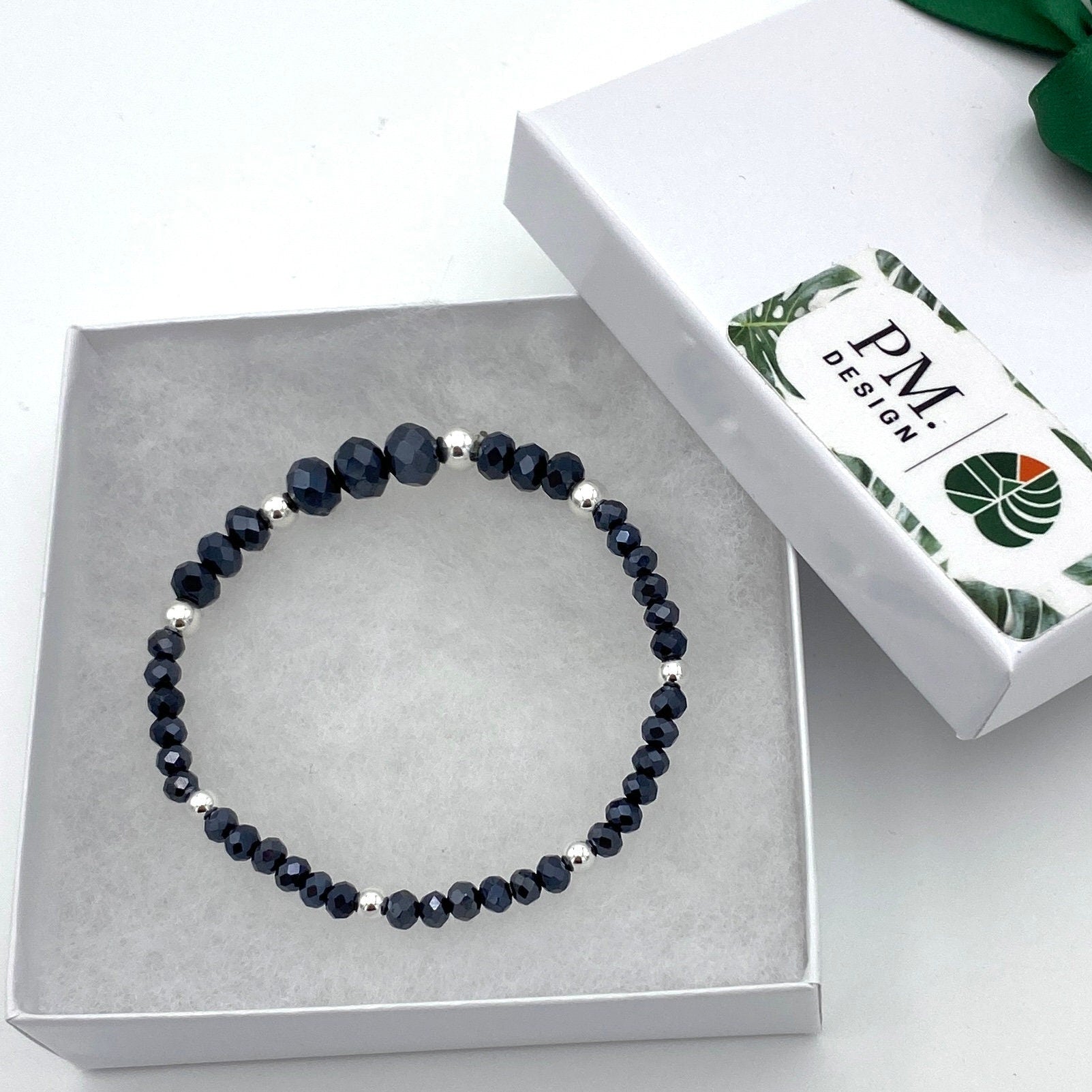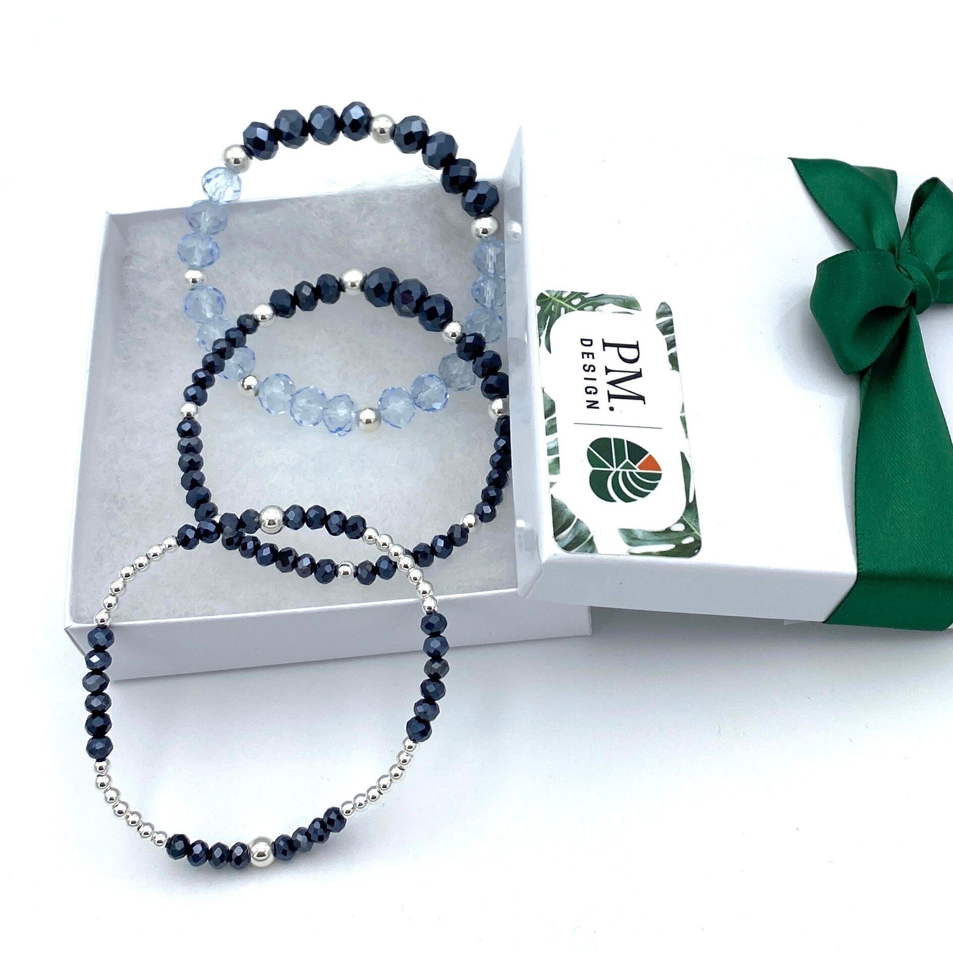 Surprise her with a Blue Crystal Silver Bracelet, featuring sterling silver beads for a touch of elegance. This stretchy, stackable set is a perfect gift, offering classic blue jewelry she'll love.