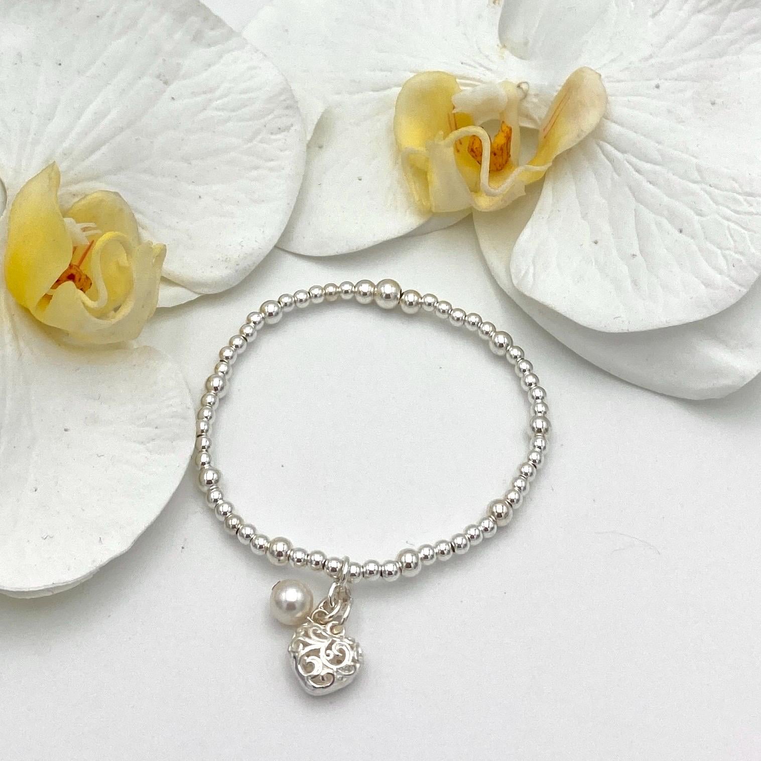 Freshwater pearl bracelet set sterling silver women minimalist jewelry pearl and heart charm wedding day accessory