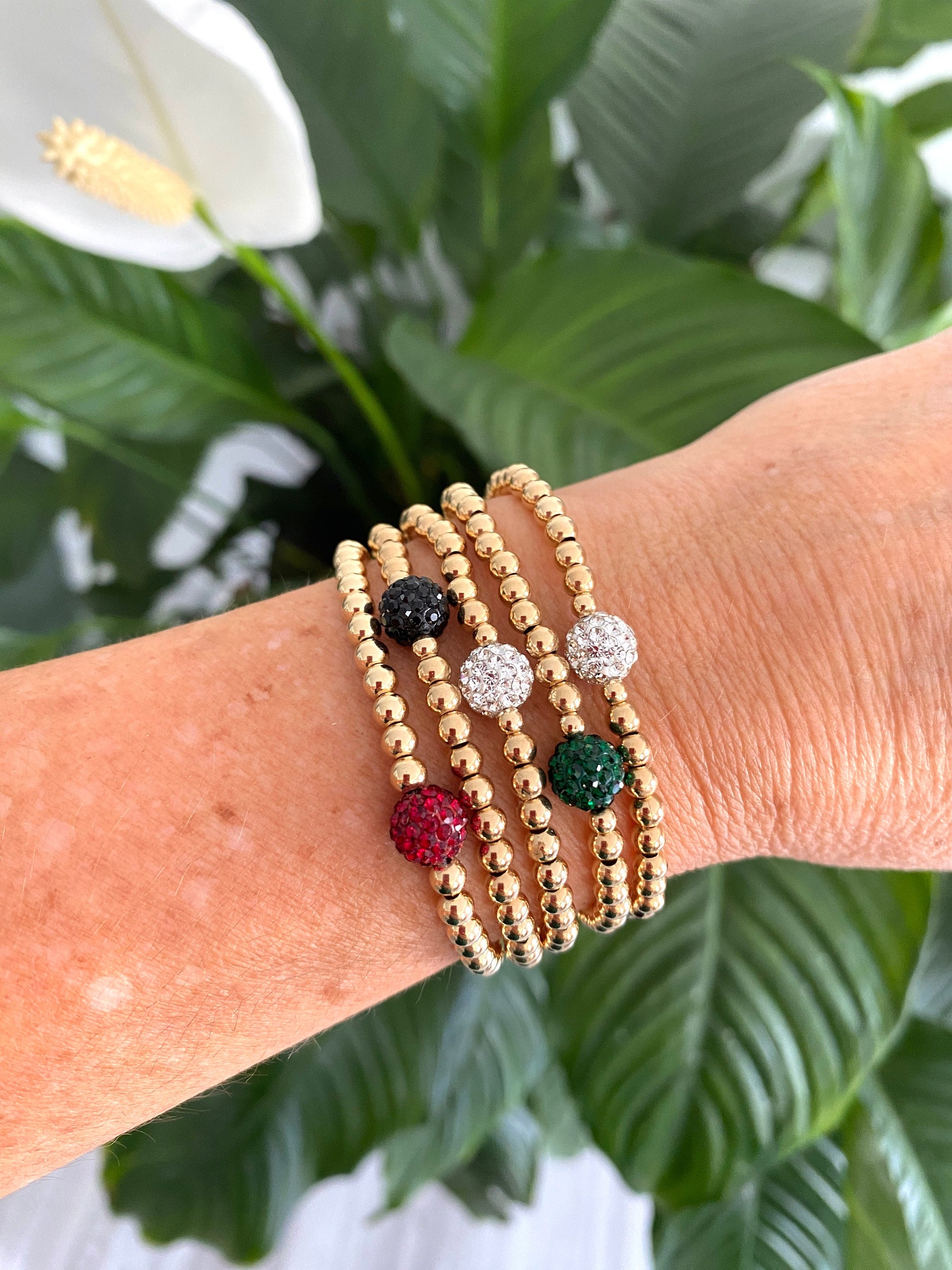 This elegant bracelet set is made with shiny gold filled beads and sparkling color of rhinestone crystal balls. you have many colors to chose . A modern design, stretchy for comfort and beauty. Perfect for birthdays, graduations or as a bright gift to make someone feel elegant and super special