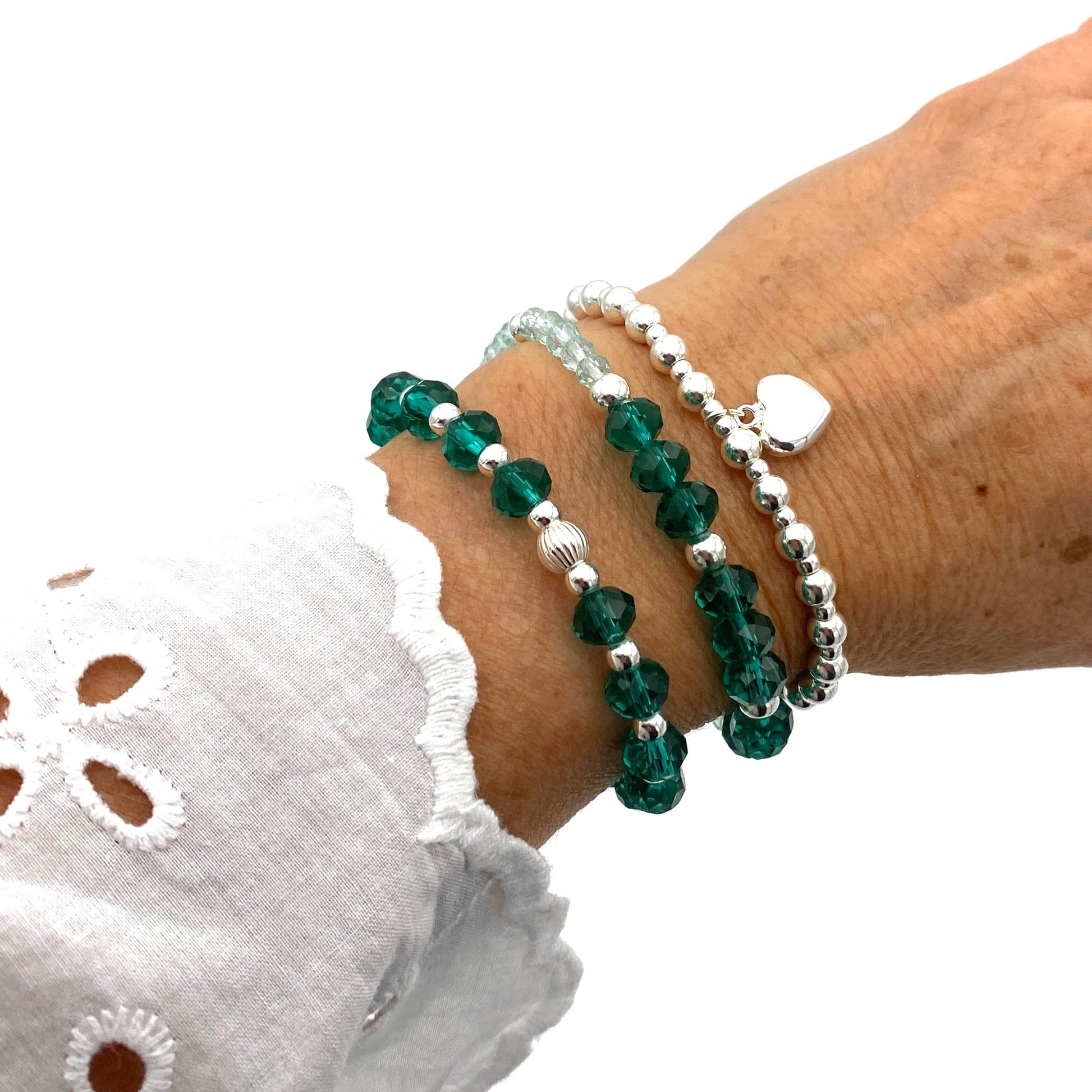 Choose our Green Crystal Silver Bracelet set for a thoughtful gift. Each piece features green crystals and a delicate heart charm, making it a special treat for her jewelry collection.