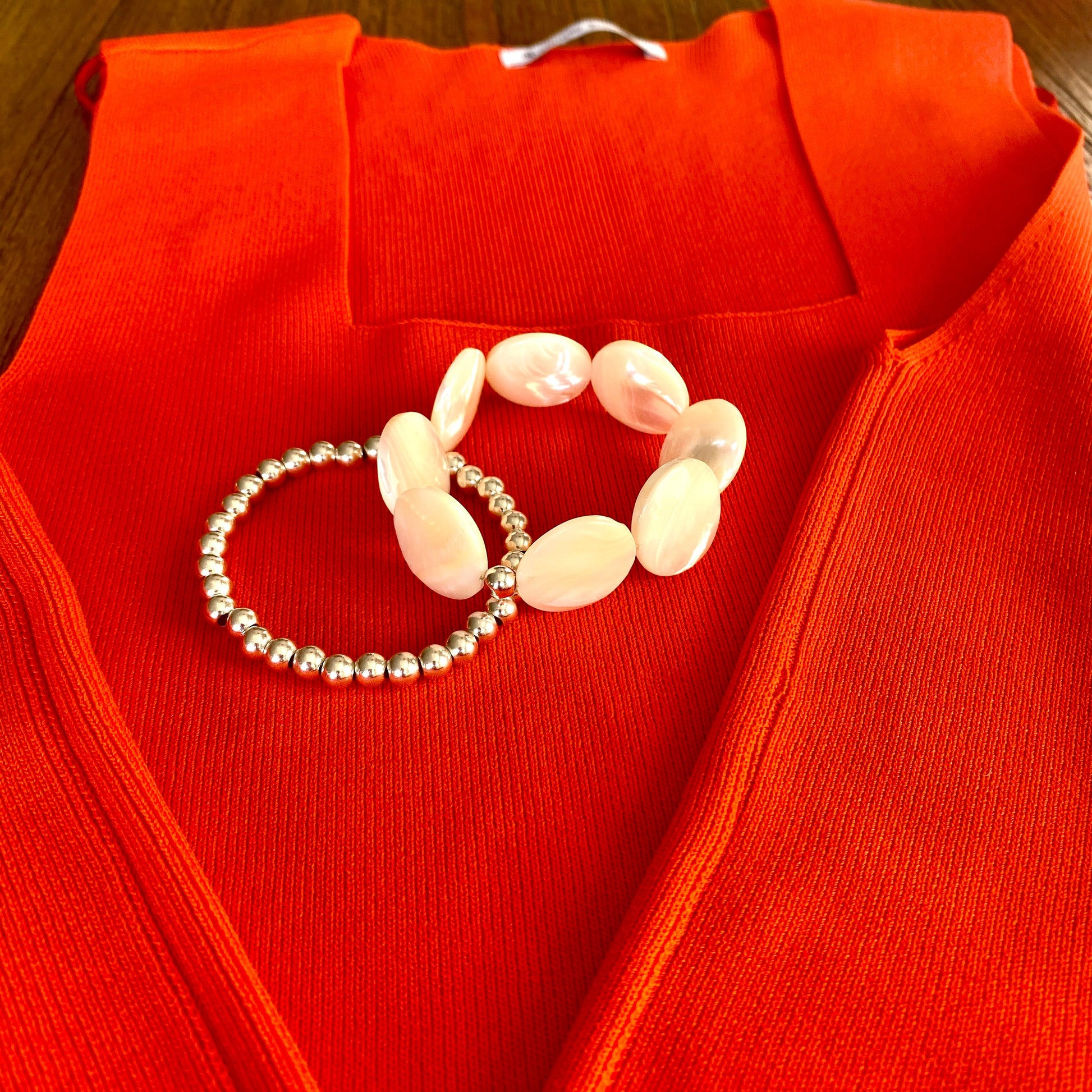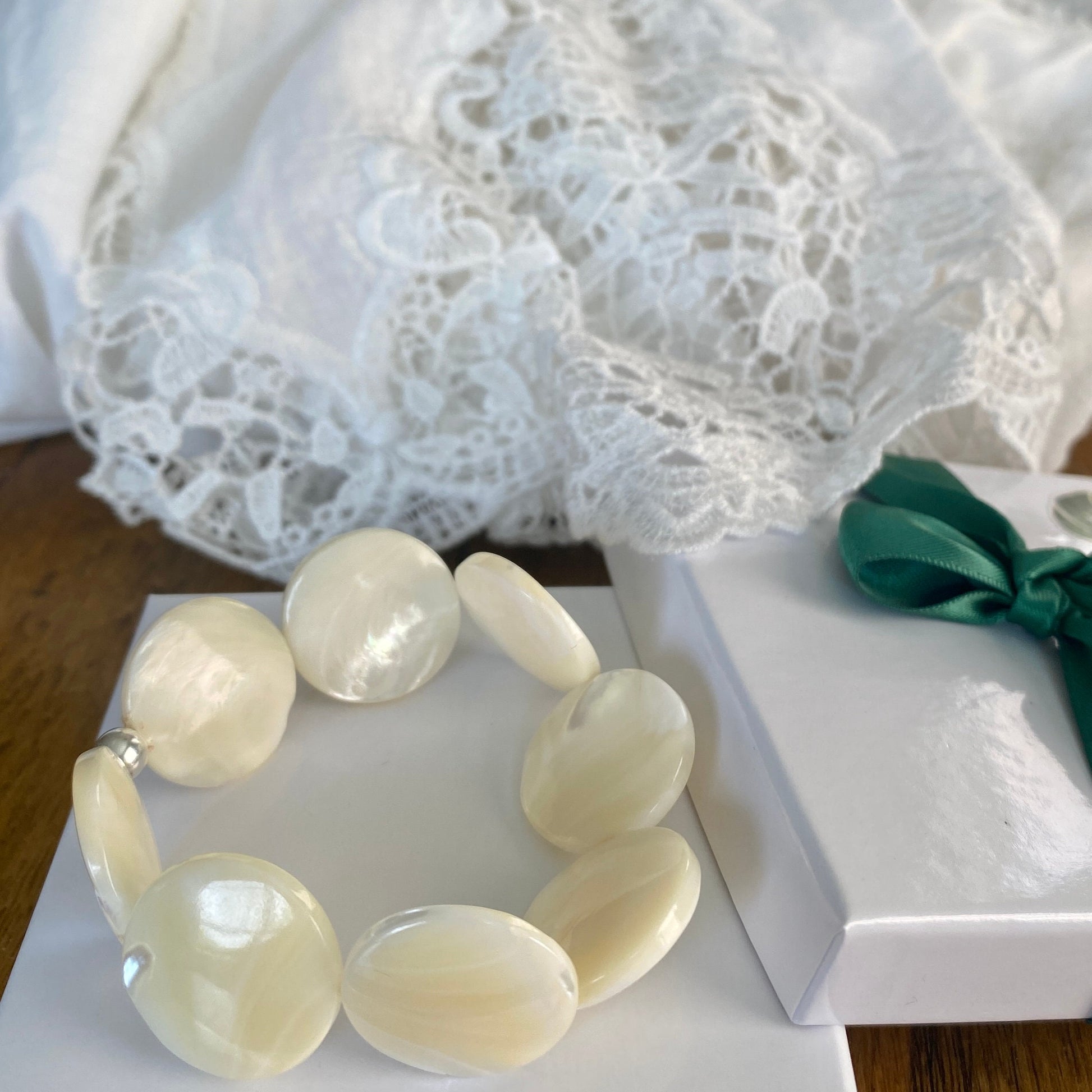 This bracelet is all about modern fashion that's super comfy to wear. You can rock it at parties or just add to your daily look. We believe you deserve the best, whether it's for you or someone special. It's handmade with big mother of pearls and a shiny sterling silver bead.
