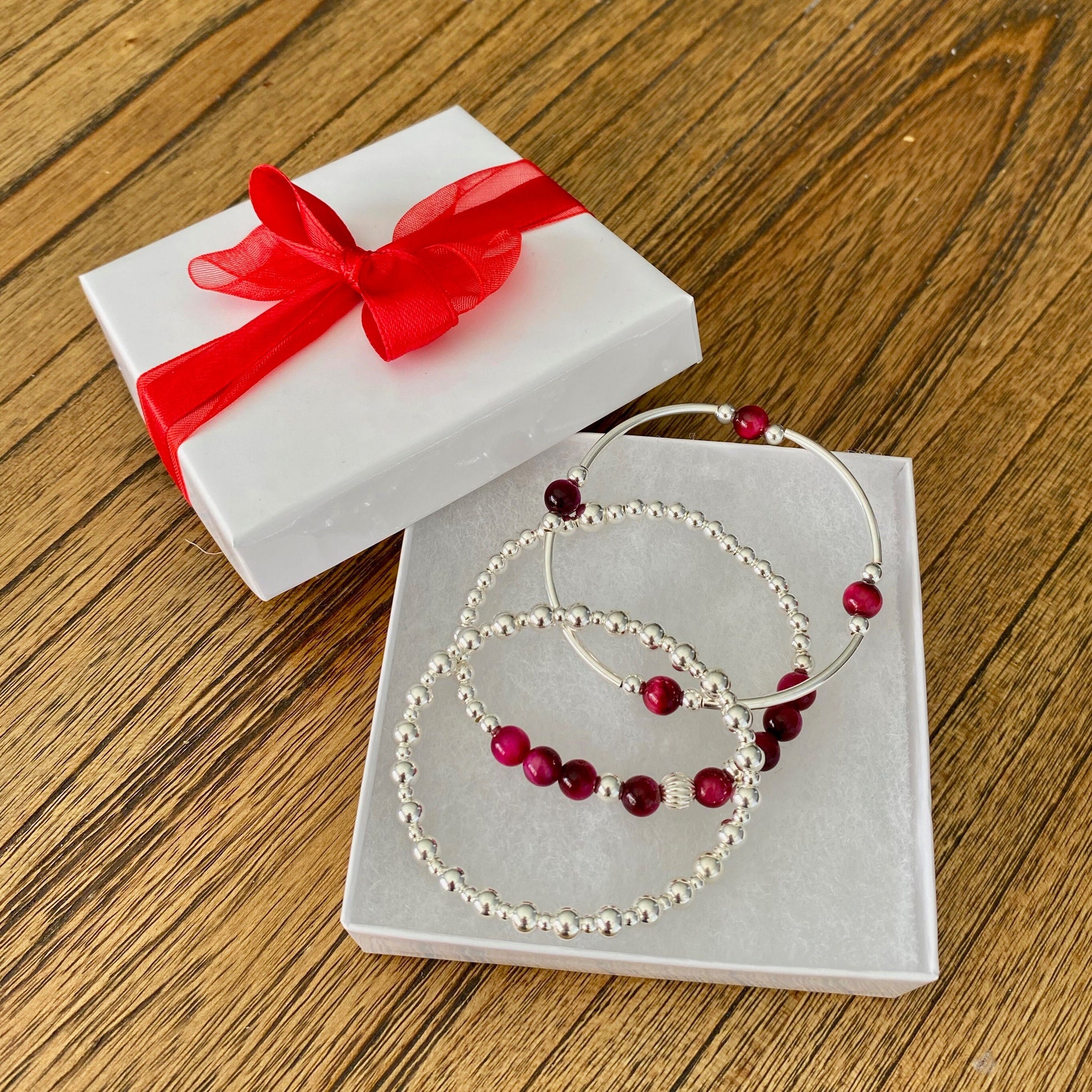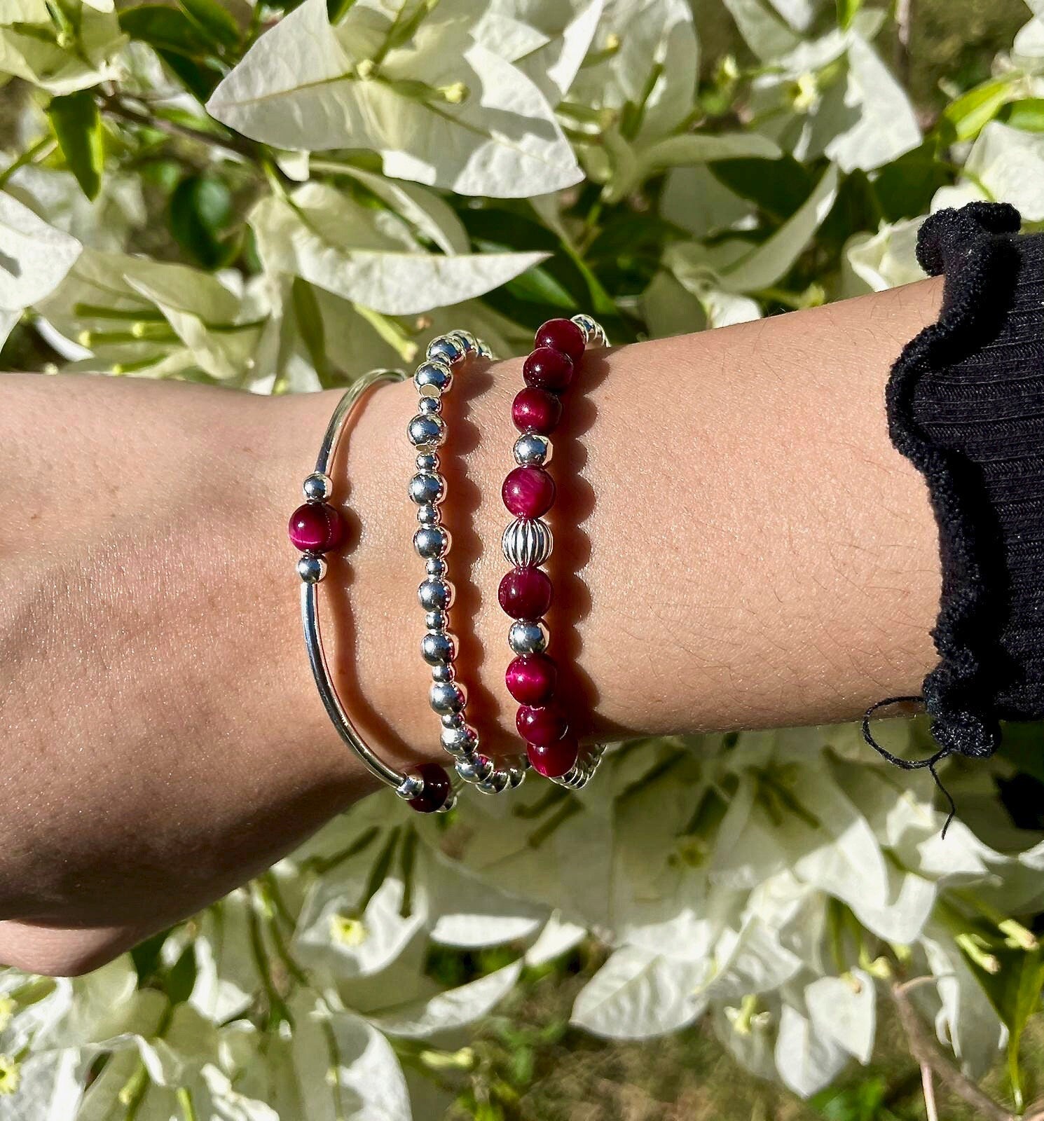 Pink Tiger Eye Sterling Silver Beaded Bracelet Layering Gift for Women