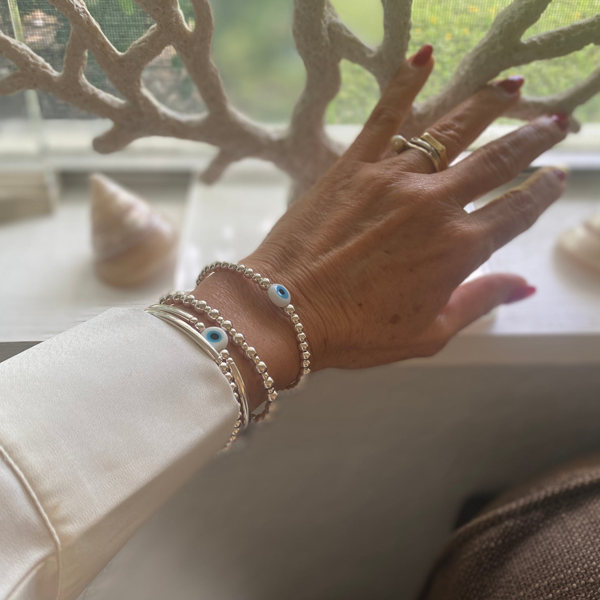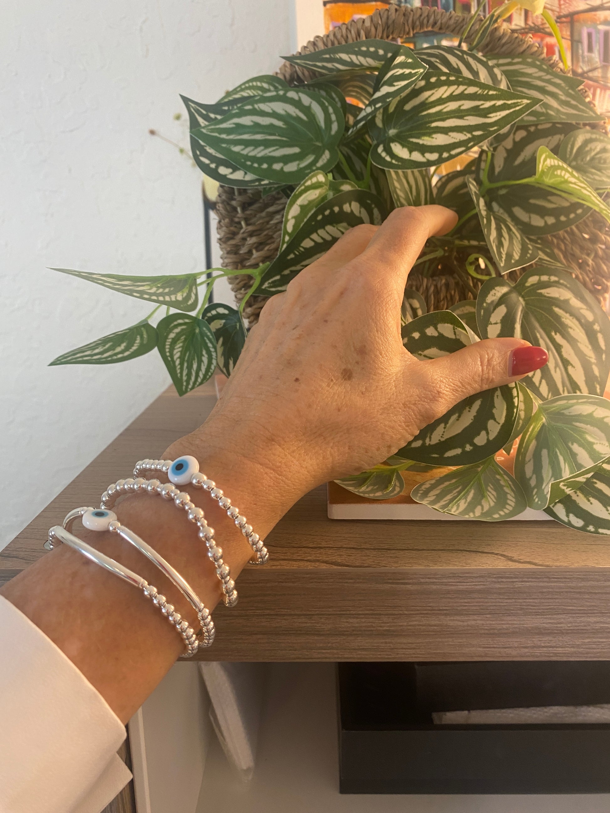 This sterling silver evil eye bracelet set is designed for protection, luck, and everyday elegance. Crafted with real sterling silver beads and stretchy cord for a perfect fit, each bracelet features a classic evil eye charm .