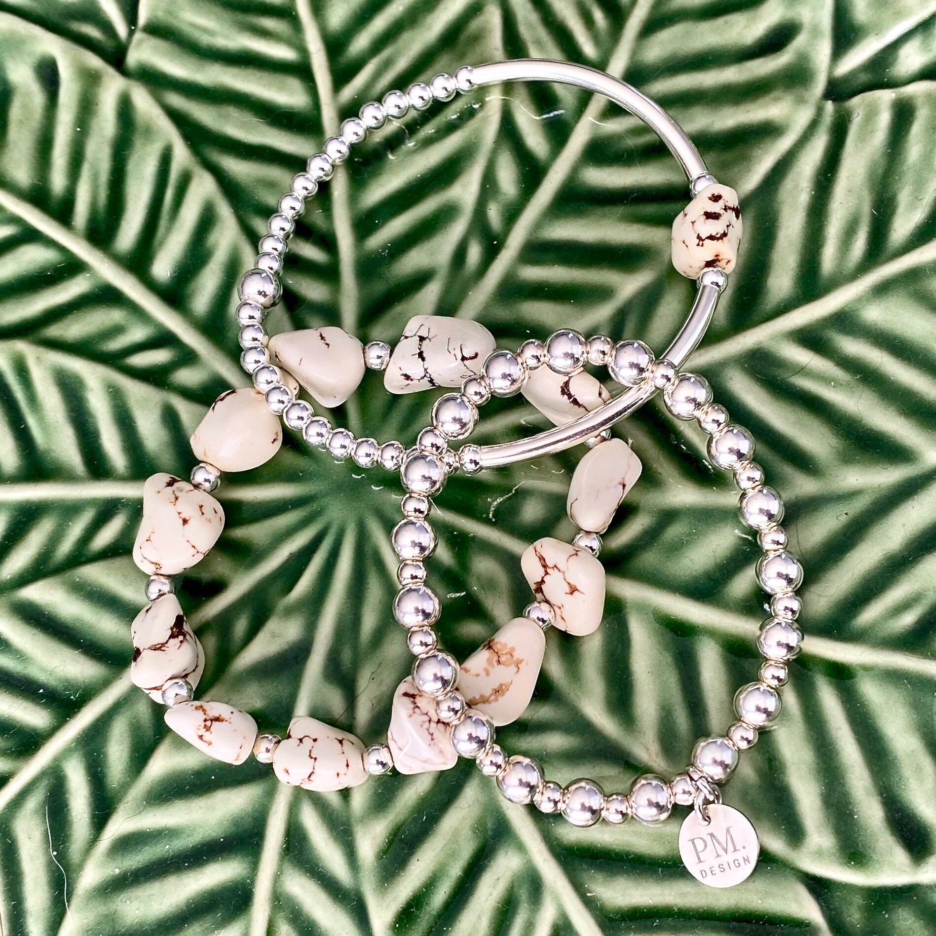 A minimalist white and silver bracelet set handmade with real Howlite nuggets and Sterling Silver. Stack them or wear solo—each one adds effortless style and calm beauty.
