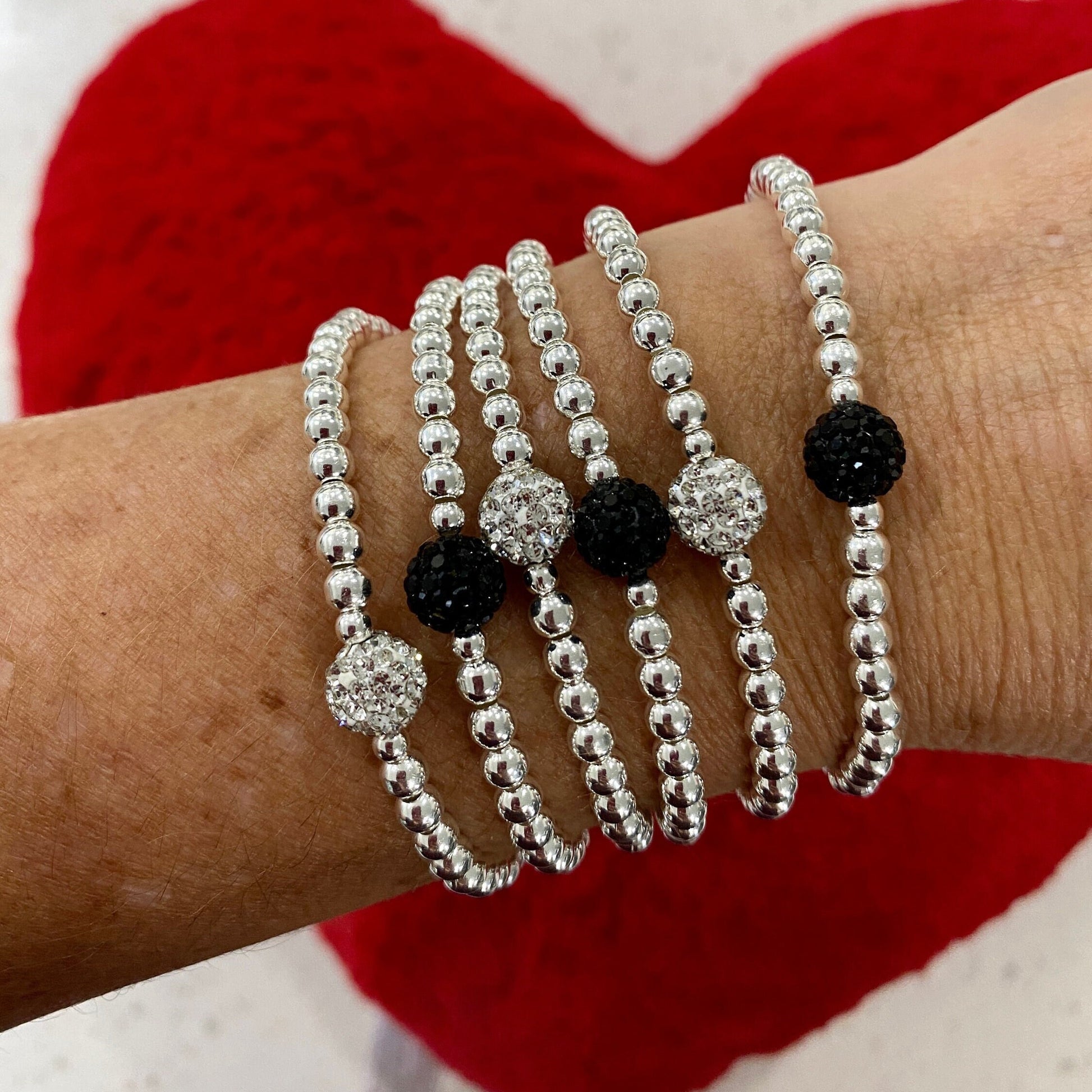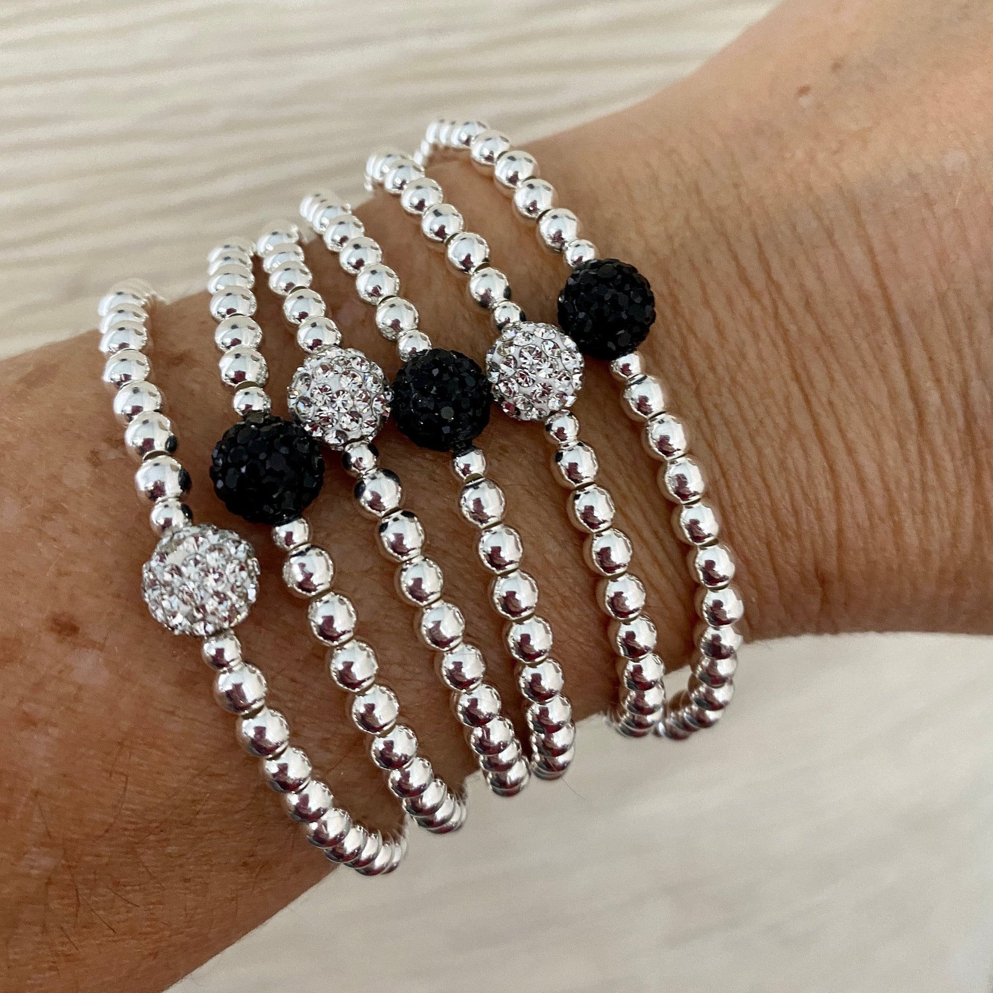 Sterling Silver Black and White Crystal Bracelet rhinestone ball bead friendship jewelry set