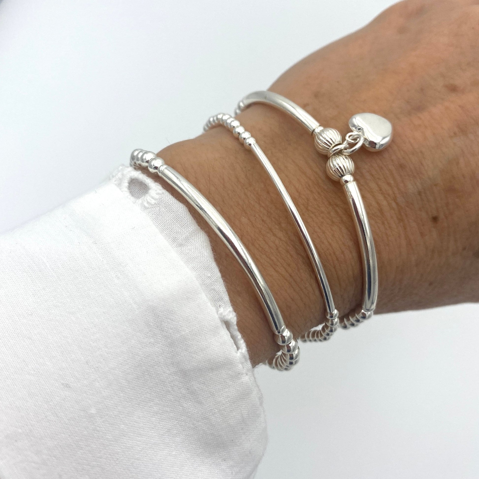 Whether you're surprising your mom, a dear friend, or treating yourself, this stackable silver bracelet offers a stylish, stretchy fit that’s both elegant and comfortable.