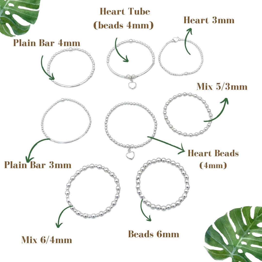 This set is handmade using sterling silver beads (3mm to 5mm), strung on durable stretch cord for an easy, comfortable fit you can slip on and off.