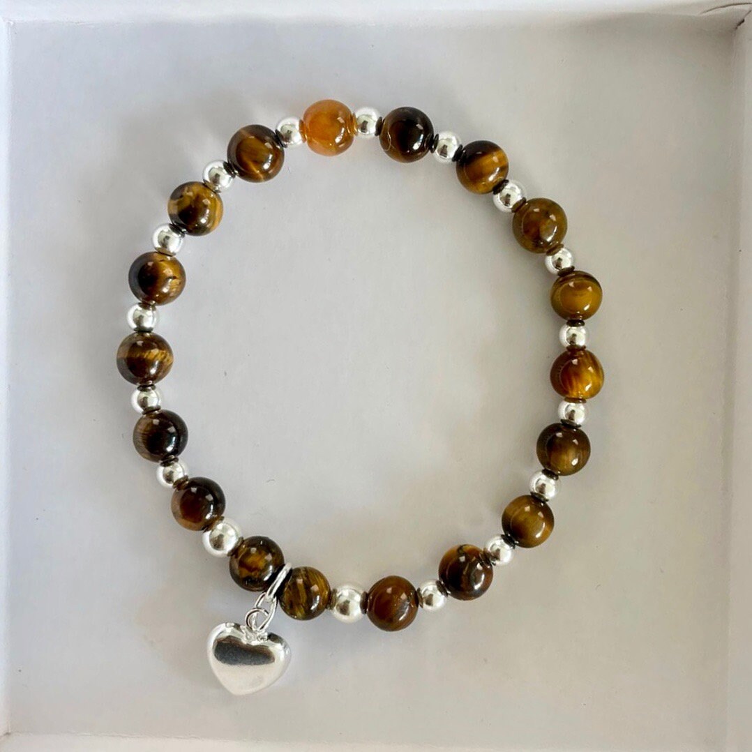 Tiger's eye sterling silver charm bracelet beaded stretchy heart jewelry set